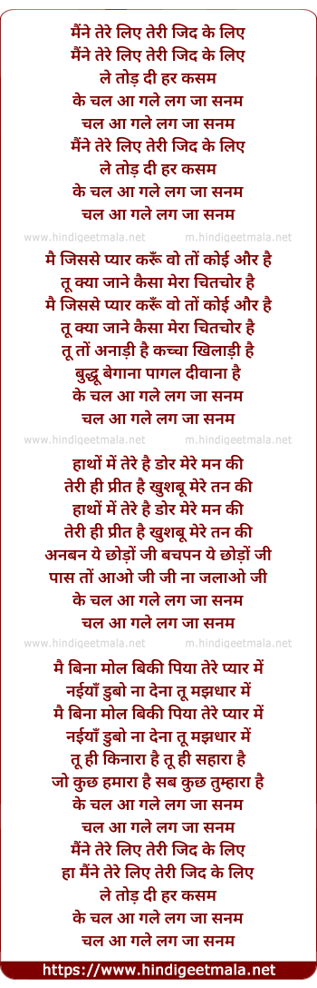 Lyrics of Maine Tere Liye Teri Zid Ke Liye - मैंने तेरे लिए तेरी जिद के लिए