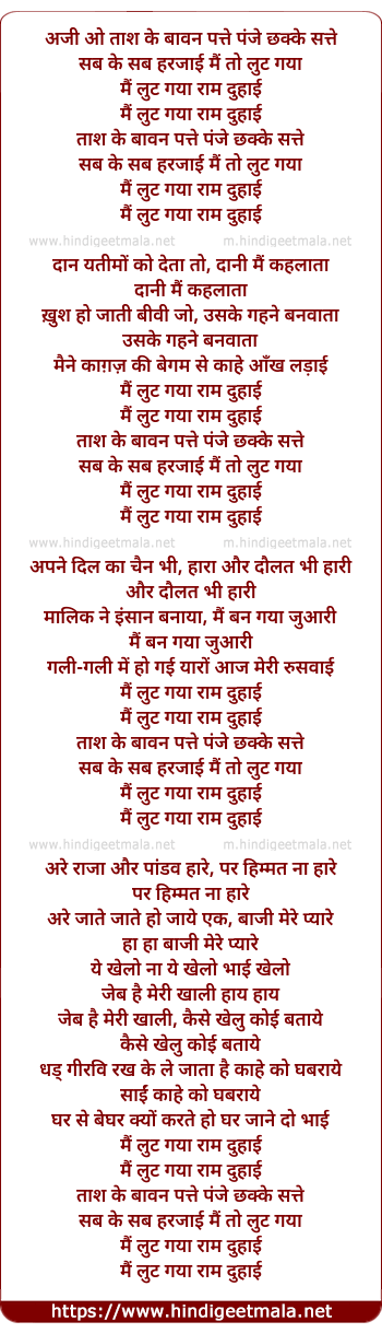Lyrics of Aji Ho Tash Ke Bawan Patte Sab Ke Sab Harjayi, Mai To Lut Gaya Ram Duhayi - अजी ओ ताश के बावन पत्ते सब के सब हरजाई, मैं तो लुट गया राम दुहाई