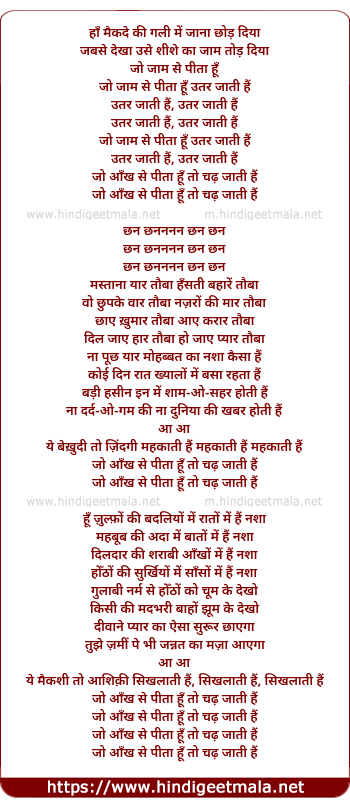 Lyrics of Maikade Ki Gali Men, Jo Jaam Se Pitaa Hun Utar Jaati Hai - मैकदे की गली में, जो जाम से पीता हूँ उतर जाती हैं