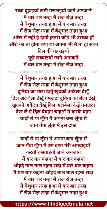 Lyrics of Main Baar Baar Tanha Hua - मैं बार बार तन्हा हुआ