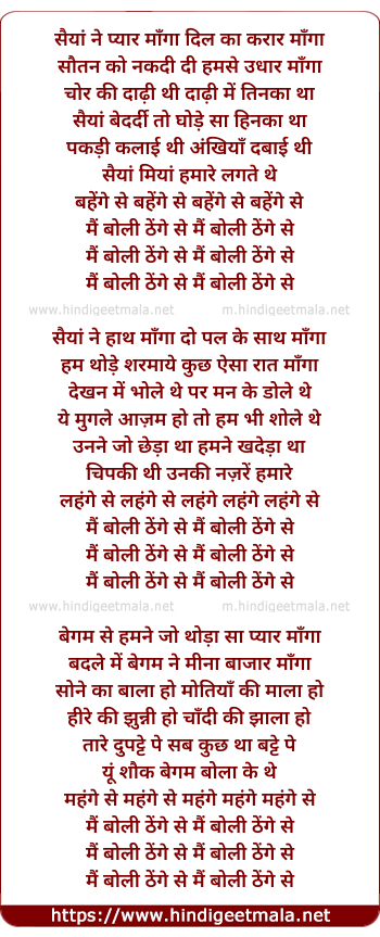 Lyrics of Main Boli Thenge Se (Saiyan Ne Pyar Maanga) - मैं बोली ठेंगे से