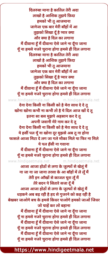 Lyrics of Main Deewana - दिलरुबा माना है कातिल तेरी अदा
