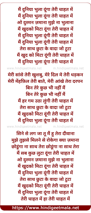 Lyrics of Main Duniyaa Bhulaa Dungaa, Teri Chaahat Men - मैं दुनिया भुला दूंगा तेरी चाहत में