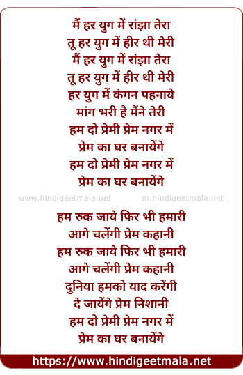 Lyrics of Main Har Yug Mein Ranjha Tera - मैं हर युग में रांझा तेरा