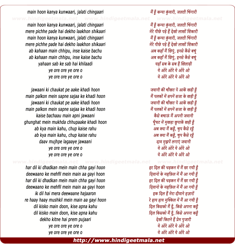 Lyrics of Main Hoon Kanya Kunwari, Jalati Chingaari - मैं हूँ कन्या कुंवारी, जलती चिंगारी
