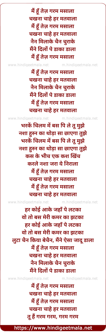 Lyrics of Main Hoon Tez Garam Masaala - मैं हूँ तेज़ गरम मसाला