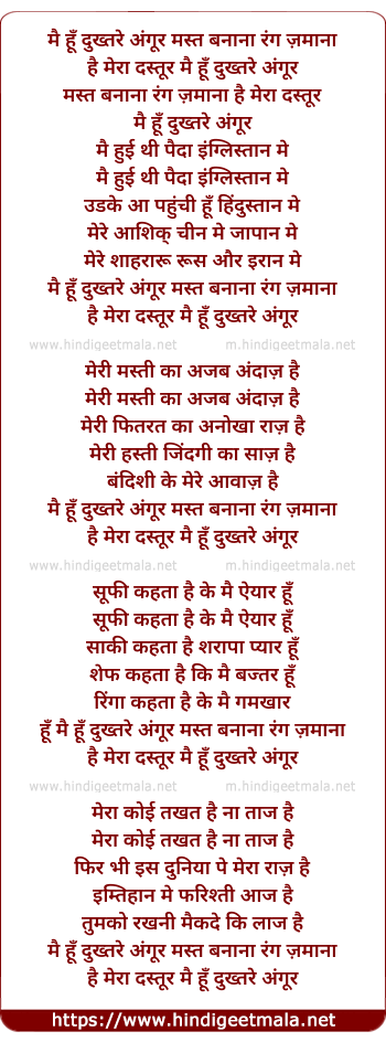 Lyrics of Main Hu Dukhtare Angoor - मैं हूँ दुख्तरे अंगूर