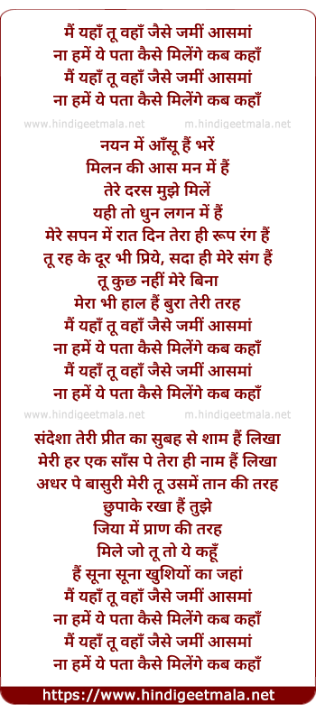 Lyrics of Main Yaha Tu Waha Jaise Jamin Aasmaa - मैं यहाँ तू वहाँ जैसे जमीं आसमां