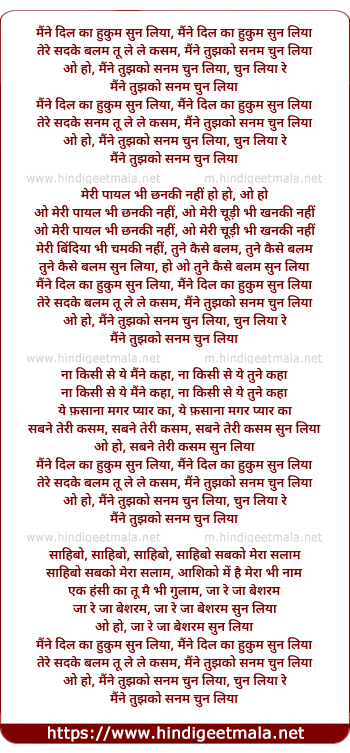 Lyrics of Maine Dil Ka Hukum Sun Liya, Tere Sadke Balam Tu Le Le Kasam - मैंने दिल का हुकुम सुन लिया तेरे सड़के बालम तू ले ले कसम