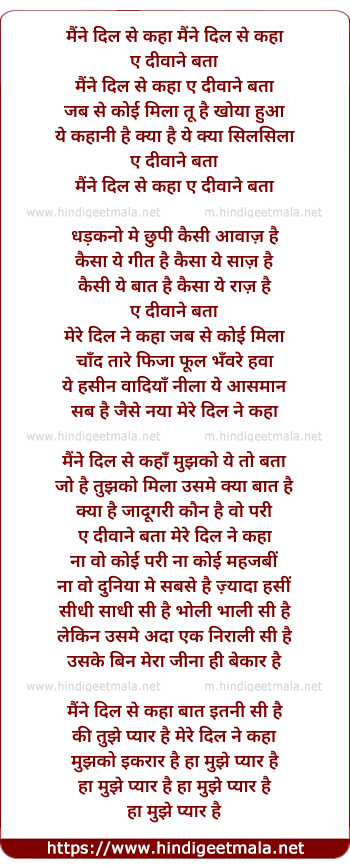 Lyrics of Maine Dil Se Kaha Ae Diwane Bata - मैंने दिल से कहा मैंने दिल से कहा