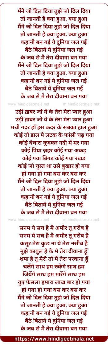 Maine Jo Dil Diyaa, Tujhe Jo Dil Diya, To Janti Hai Kyaa Hua - मैंने जो दिल दिया, तुझे जो दिल दिया, तो जानती है क्या हुआ
