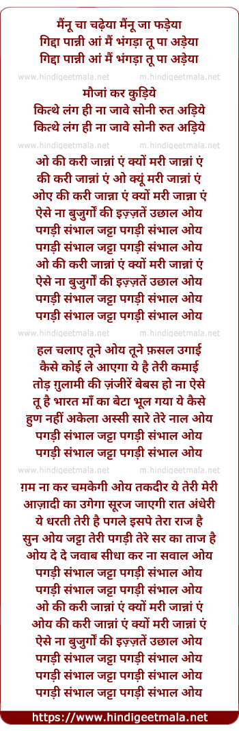 Lyrics of Mainnu Chaa Chadheyaa, Pagadi Sambhaal Jattaa - मैंनू चा चढ़ेया, पगड़ी संभाल जट्टा