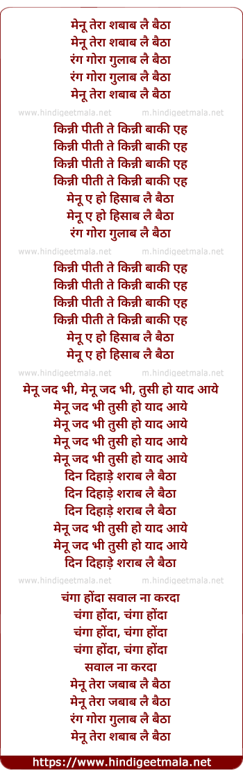 Lyrics of Mainu Tera Shabaab Lai Baitha - मेनू तेरा शबाब लै बैठा