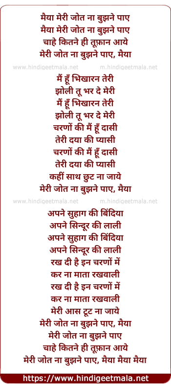 Lyrics of Maiya Meri Jyot Na Bujhane Paye - मैया मेरी जोत ना बुझने पाए