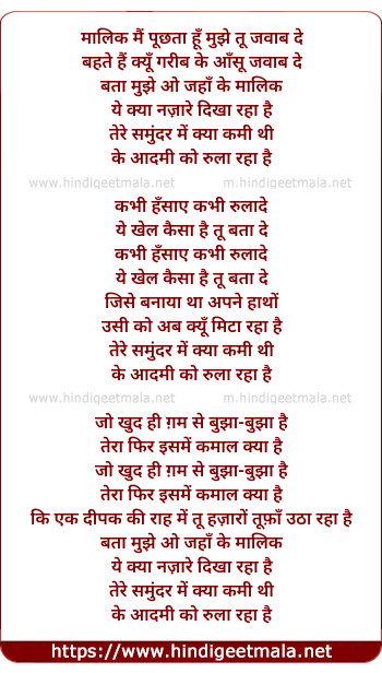 Lyrics of Malik Mai Puchhta Hu, Bata Mujhe O Jaha Ke Malik - मालिक मैं पूछता हूँ मुझे तू जवाब दे