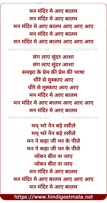 Lyrics of Man Mandir Me Aaye Balam - मन मंदिर मे आए बालम