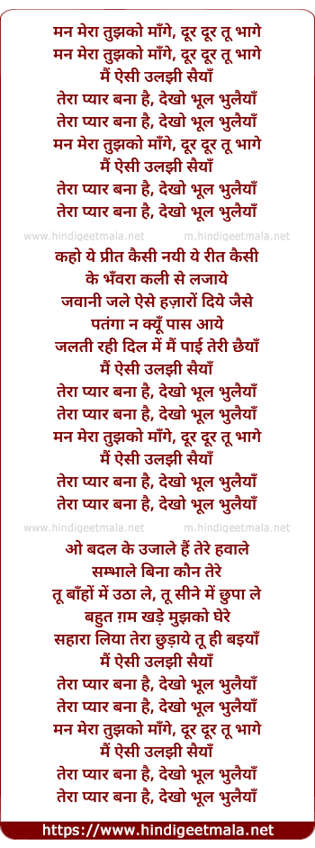 Lyrics of Man Mera Tujhko Mange, Dur Dur Tu Bhage - मन मेरा तुझको माँगे, दूर दूर तू भागे