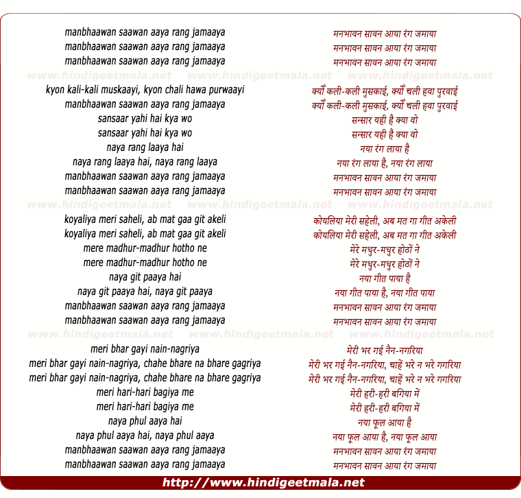 Lyrics of Manabhawan Sawan Aaya Rang Jamaya - मनभावन सावन आया रंग जमाया