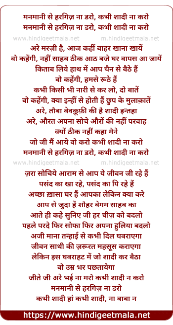 Lyrics of Manamani Se Haragiz Na Daro, Kabhi Shadi Na Karo - मनमानी से हरगिज़ ना डरो, कभी शादी ना करो