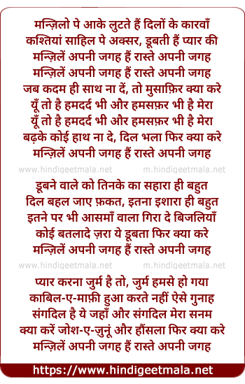 Lyrics of Manzilon Pe Aake Lutate, Hain Dilon Ke Kaaravaan - मन्ज़िलों पे आके लुटते हैं दिलों के कारवाँ