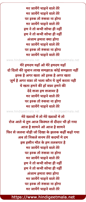 Lyrics of Mar Jayenge Chahne Wale Tere - मर जायेंगे चाहने वाले तेरे