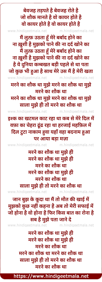 Lyrics of Marne Ka Shauk Tha Mujhe - मरने का शौक था मुझे