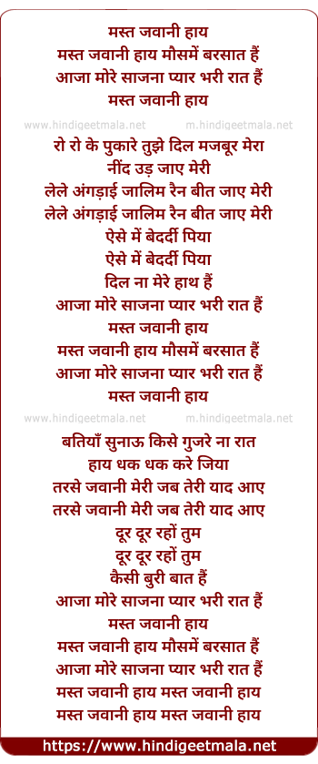 Lyrics of Mast Jawani Hai Mausame Barsaat Hai - मस्त जवानी हाय मौसमें बरसात हैं