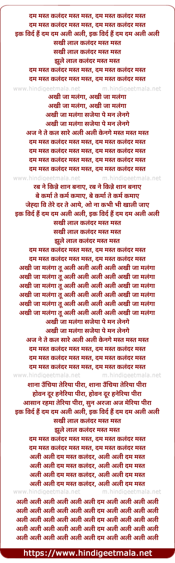 Lyrics of Mast Kalandar (Mtv) - दम मस्त कलंदर मस्त मस्त, दम मस्त कलंदर मस्त
