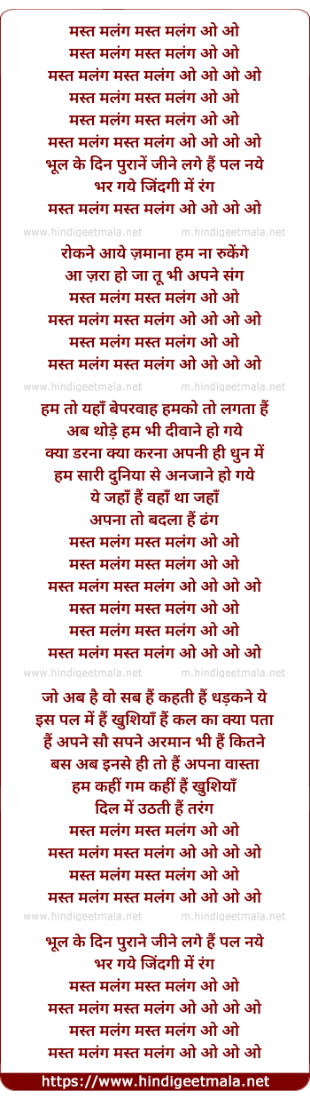 Lyrics of Mast Malang Mast Malang O O - मस्त मलंग मस्त मलंग ओ ओ