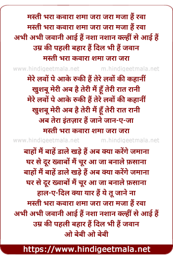 Lyrics of Masti Bhara Kawaara Sama - मस्ती भरा कवारा शमा