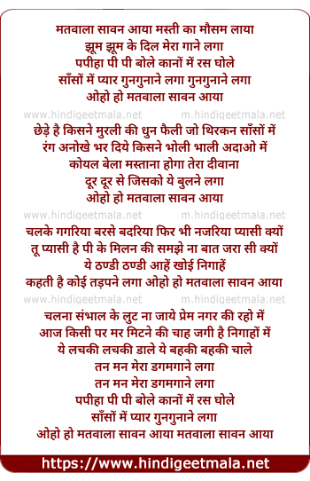 Lyrics of Matwala Savan Aaya Masti Ka Mausam Laya - मतवाला सावन आया मस्ती का मौसम लाया