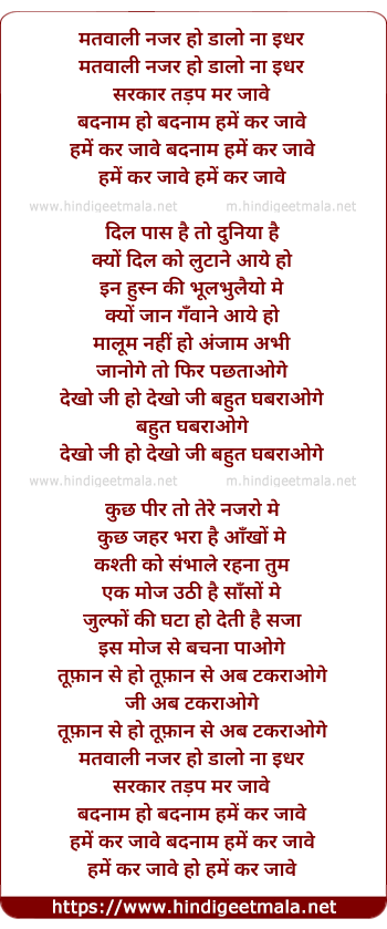 Lyrics of Matwali Nazar Ho Dalo Na Idhar - मतवाली नजर हो डालो ना इधर