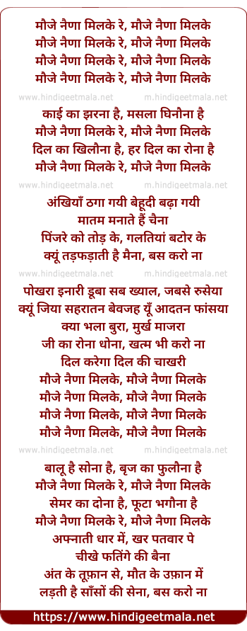 Lyrics of Mauje Naina - मौजे नैणा मिलके रे, मौजे नैणा मिलके