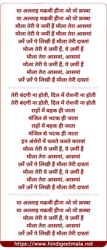 Lyrics of Maula Teri Ye Zameen Hai - या अल्लाह मक्रबी हीना ओ यो क़स्बा