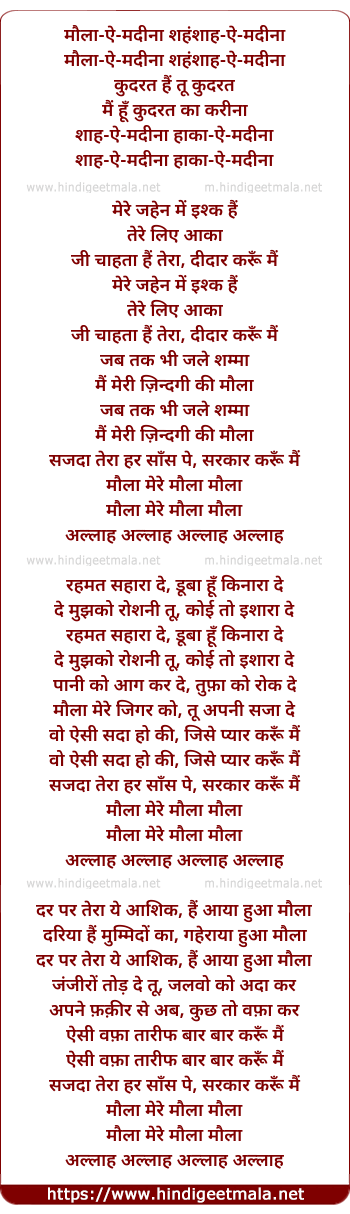 Lyrics of Maula-E-Madina - मौला-ऐ-मदीना शहंशाह-ऐ-मदीना