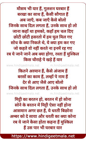 Lyrics of Mausam Bhi Yaar Hai - मौसम भी यार हैं, गुलशन घरबार हैं