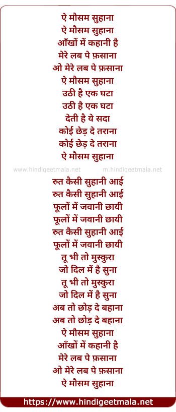 Lyrics of Mausam Hai Suhana Aankho Me Kahani Hai - ऐ मौसम सुहाना