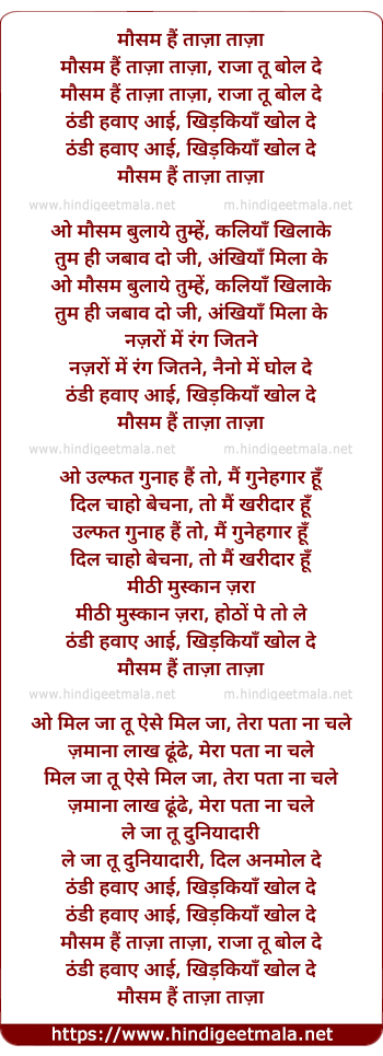 Lyrics of Mausam Hai Taza Taza Raja Tu Bol De - मौसम हैं ताज़ा ताज़ा राजा तू बोल दे