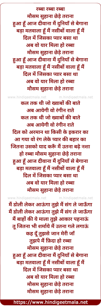 Lyrics of Mausam Suhana Chede Tarana - मौसम सुहाना छेड़े तराना