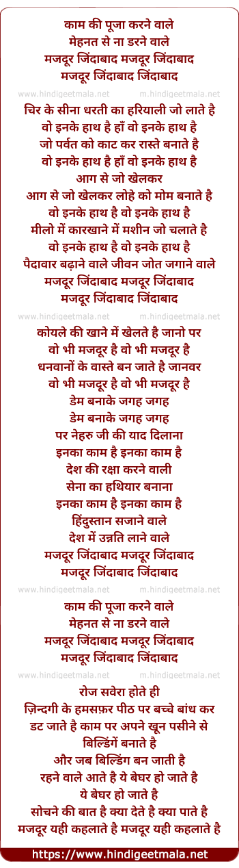 Lyrics of Kam Ki Puja Karne Wale Mehnat Se Na Darne Wale - काम की पूजा करने वाले मेहनत से ना डरने वाले