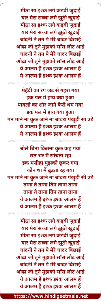 Lyrics of Meetha Sa Ishq Lage Kadvi Judai - मीठा सा इश्क लगे कड़वी जुदाई
