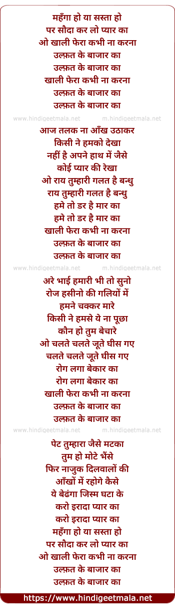 Lyrics of Mehanga Ho Ya Sasta Ho Par Sauda Kar Lo Pyar Ka - महँगा हो या सस्ता हो पर सौदा कर लो प्यार का