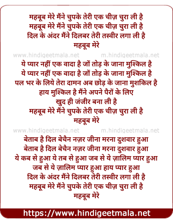 Lyrics of Mehboob Mere Maine Chupke - महबूब मेरे मैंने चुपके
