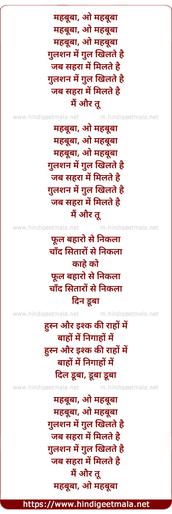 Lyrics of Mehbuba (Gulshan Me Gul Khilte Hai) (A Tribute To Panchamda) - महबूबा, ओ महबूबा
