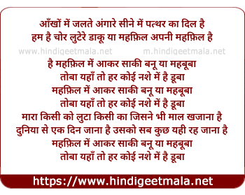 Lyrics of Mehfil Me Aakar Saaqi Banu Ya Mehbooba - आँखों में जलते अंगारे सीने में पत्थर का दिल है