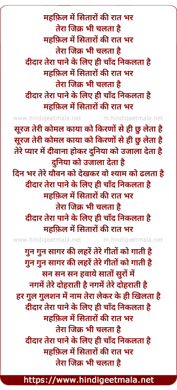 Lyrics of Mehfil Me Sitaro Ki Raat Bhar - महफ़िल में सितारों की रात भर