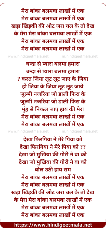Lyrics of Mera Banka Balamwa Lakho Me Ek - मेरा बांका बलमवा लाखों में एक
