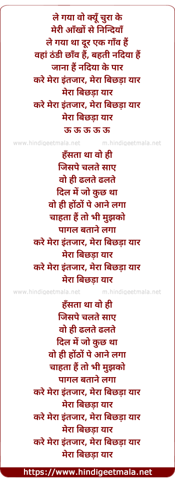 Lyrics of Mera Bichra Yaar - ले गया वो क्यूँ चुरा के