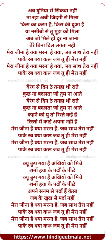 Lyrics of Mera Jeena Hai Kya Marna Hai Kya (Remix) - अब दुनिया से सिकवा नहीं