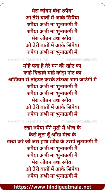 Lyrics of Mera Joban Bandha Rupiya - मेरा जोबन बंधा रुपैया